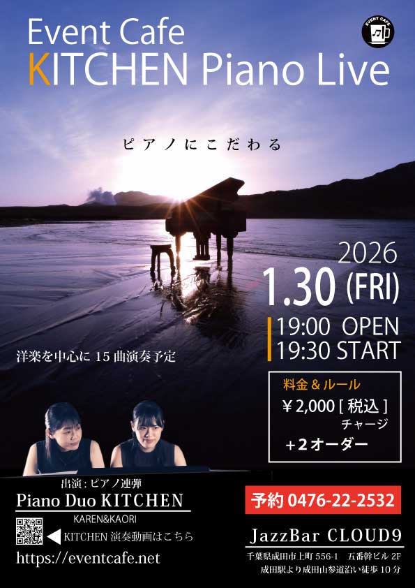 - 2026年1月30日CLOUD9(成田市)にて"KITCHEN"ライブを行います。連弾のピアノライブを是非ご覧ください。